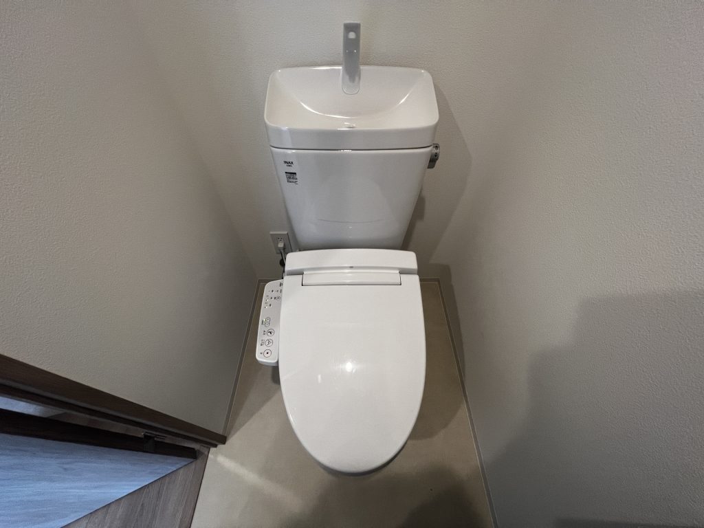 全体が白で統一されたシンプルなデザインで、清潔感があり便器の上部に手洗器が付いたタンクが採用されています。