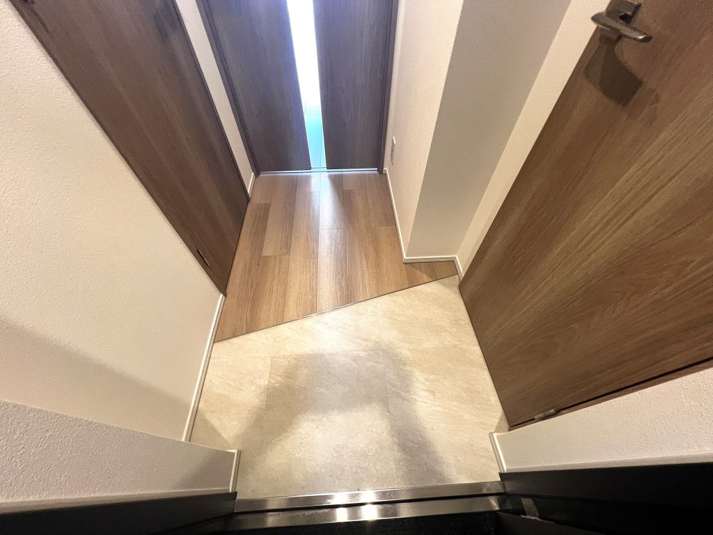 単調になりがちな玄関に個性が加わり、温かみのある木目調のフローリングが、清潔感と居心地の良さを両立させています。
