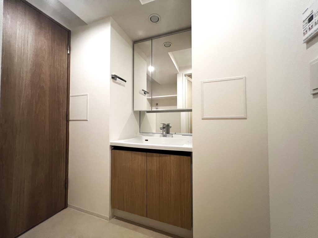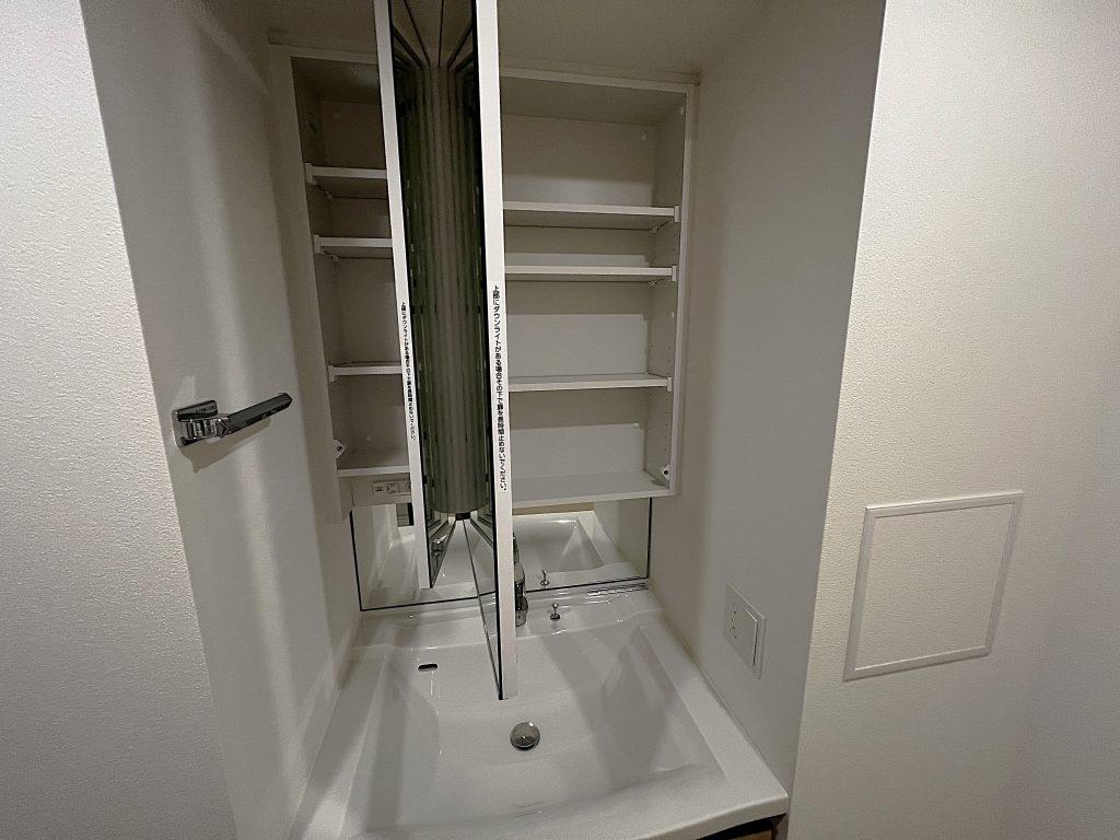 鏡と収納が一体となった三面鏡タイプの洗面台