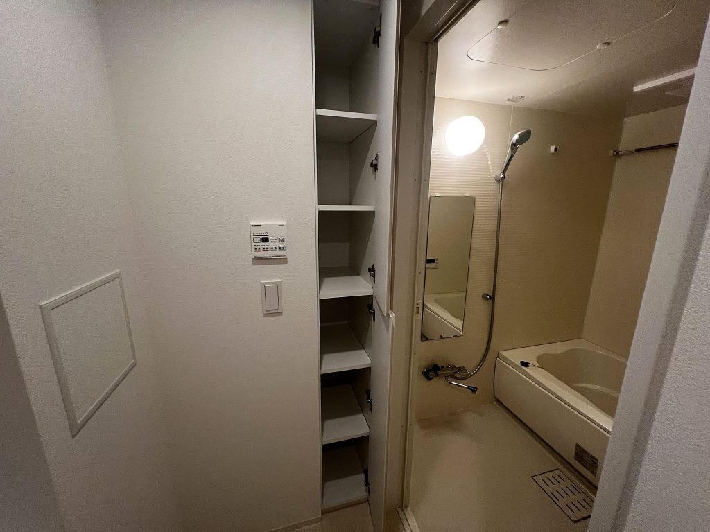 タオルや洗剤、シャンプーなどのバスグッズをまとめて収納できる棚があり、常にすっきりとした空間を保てます。