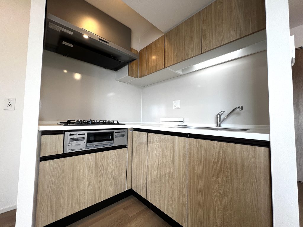 下部のキッチンキャビネットと同じ木目調のデザインで、空間に統一感が生まれます。