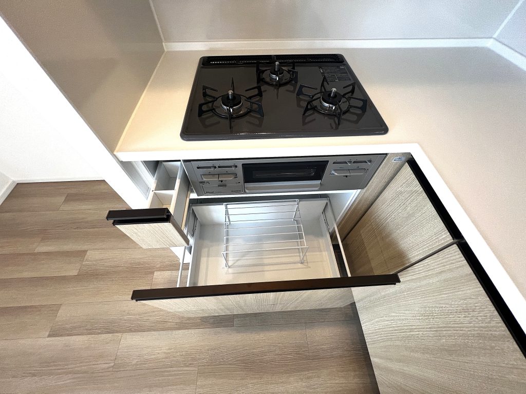 吊戸棚とシンク下、そして引き出し収納の3つの収納スペースが充実しています。