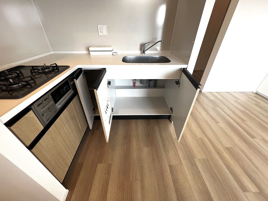 シンク下収納は大きな鍋やフライパン、キッチン家電なども収納できる大容量のスペースです