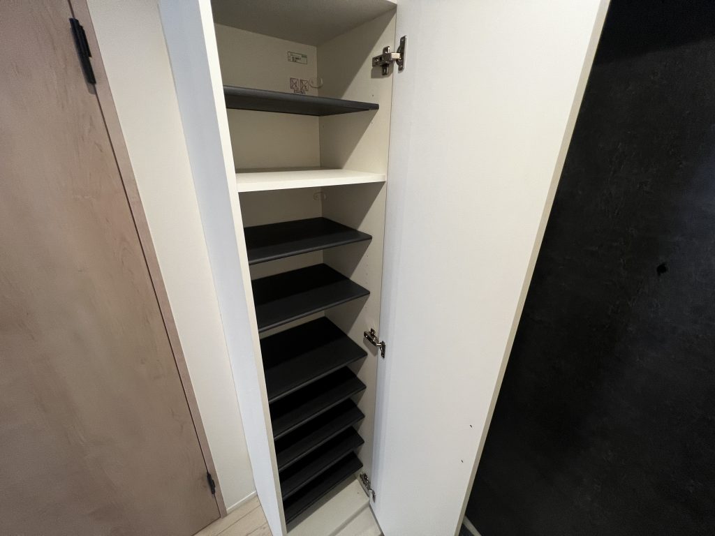 玄関右側には、シューズボックスが設置され、たくさんの靴をきれいに収納でき、玄関がスッキリと片付きます。