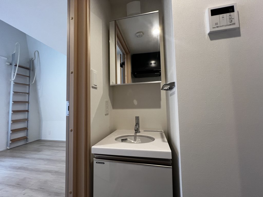 また、壁には小物置きや鏡が設置されており、使い勝手も良好です。