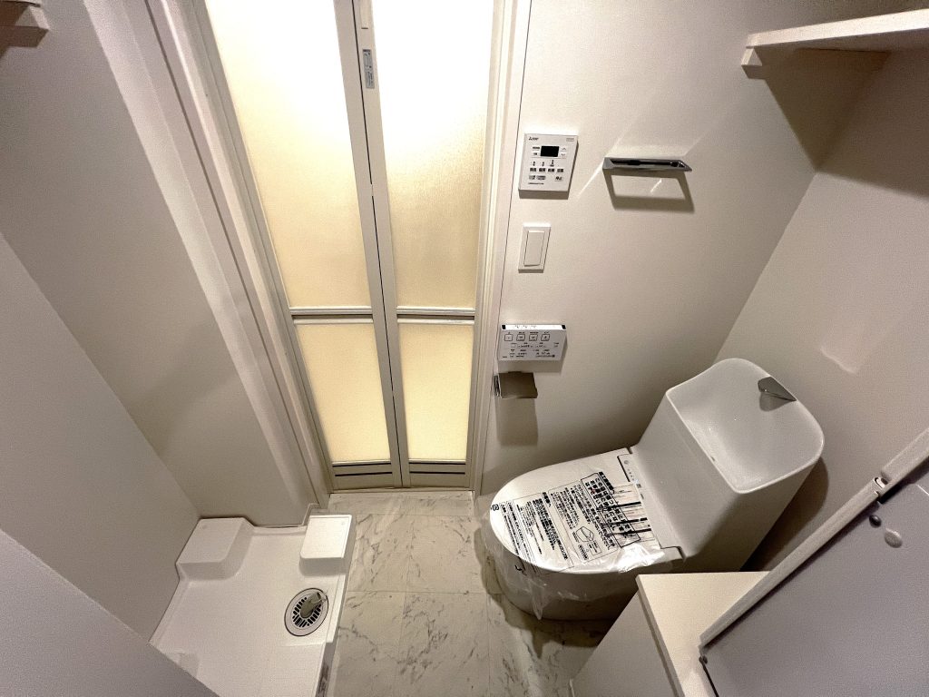 壁には温水洗浄便座のリモコンが設置されており、機能面も充実しています。