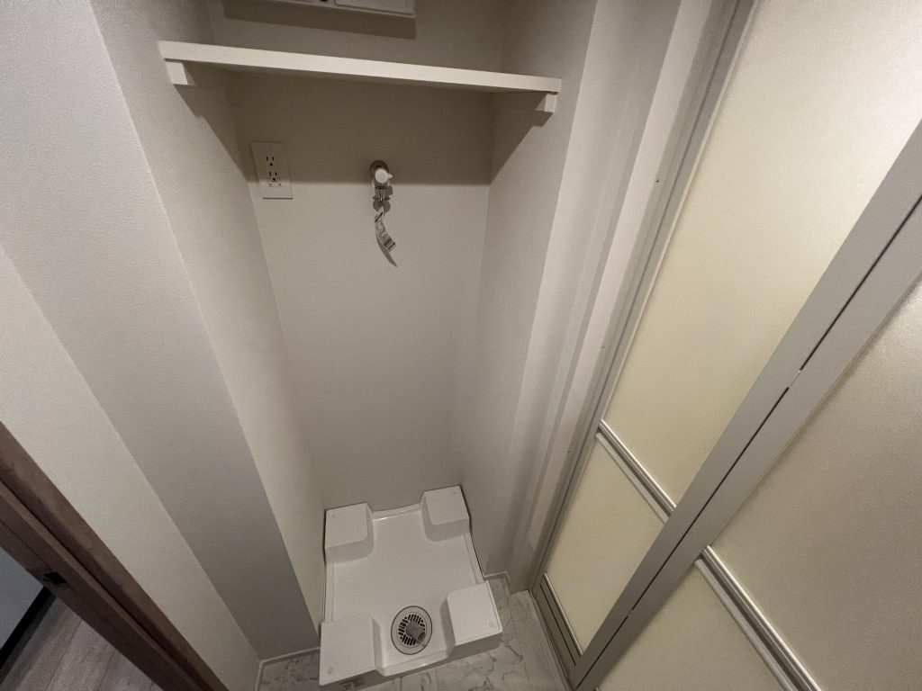 洗濯機置き場の上部には、洗剤や柔軟剤を置ける棚が備え付けられており、洗剤類をすぐに手に取れる場所に収納できるので、家事の効率が上がります。