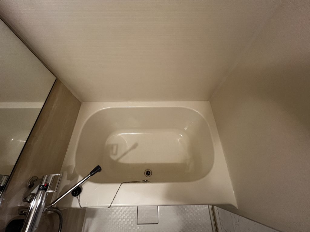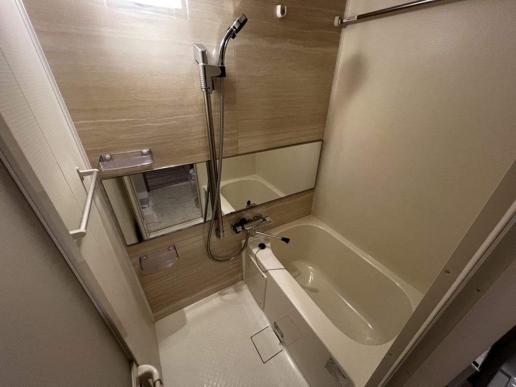 温かみのあるベージュ系の壁面パネルと白い浴槽が、落ち着いた雰囲気のバスルーム。