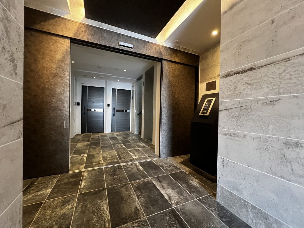 中央に設置されたオートロックパネルは、現代的で無駄のないデザイン。