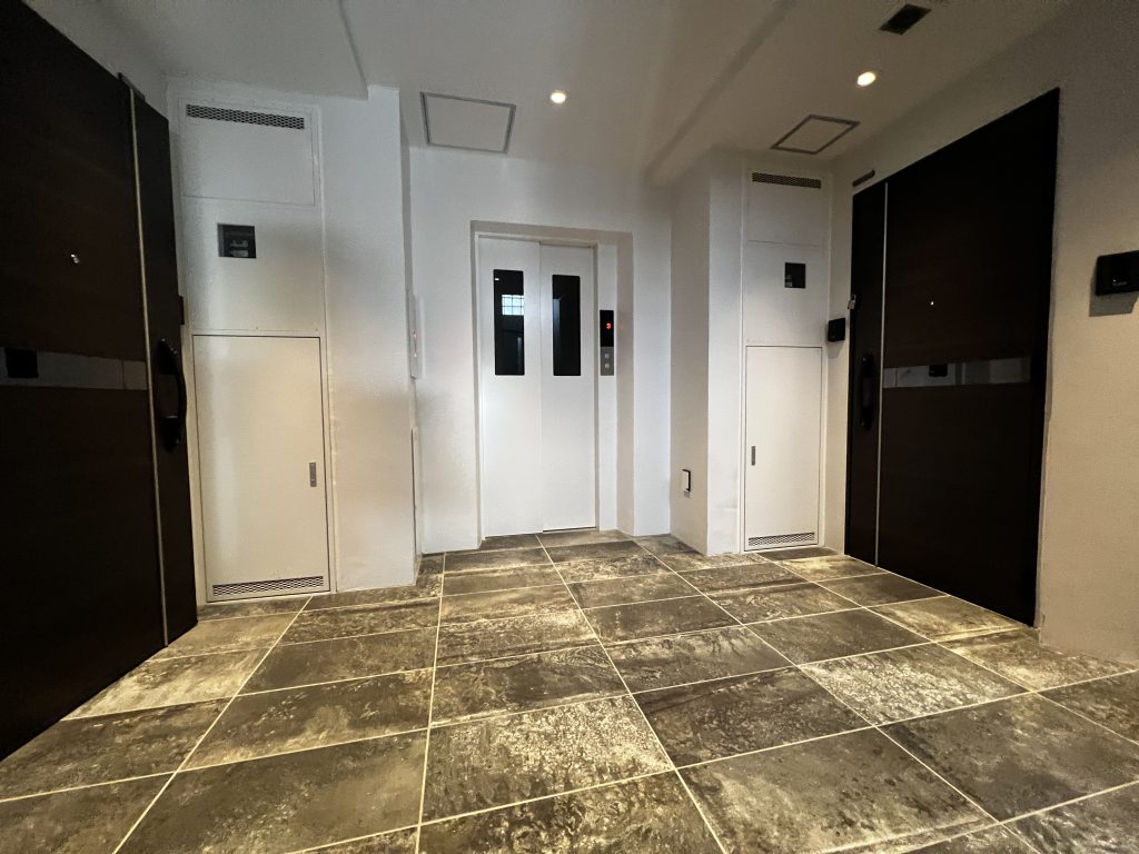 奥のエレベーターホールのダウンライトも相まって、夜間でも明るく安全かつドラマティックな雰囲気を演出します。