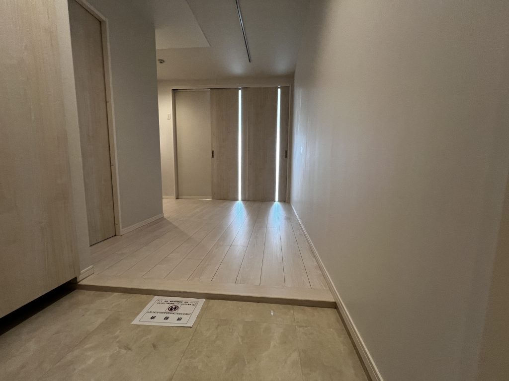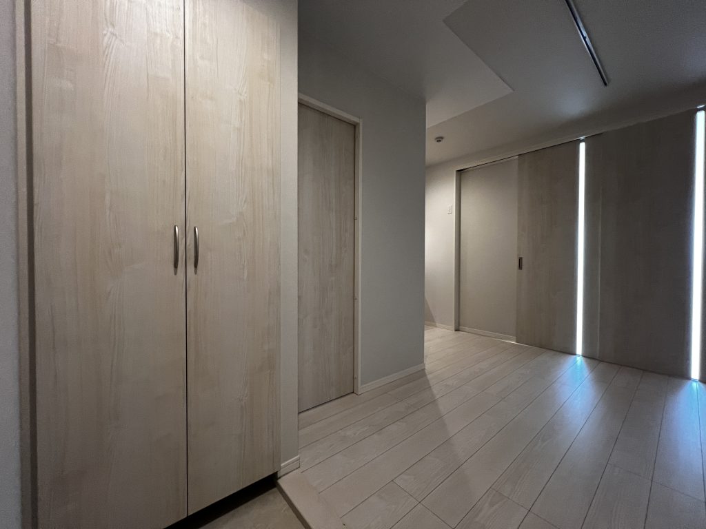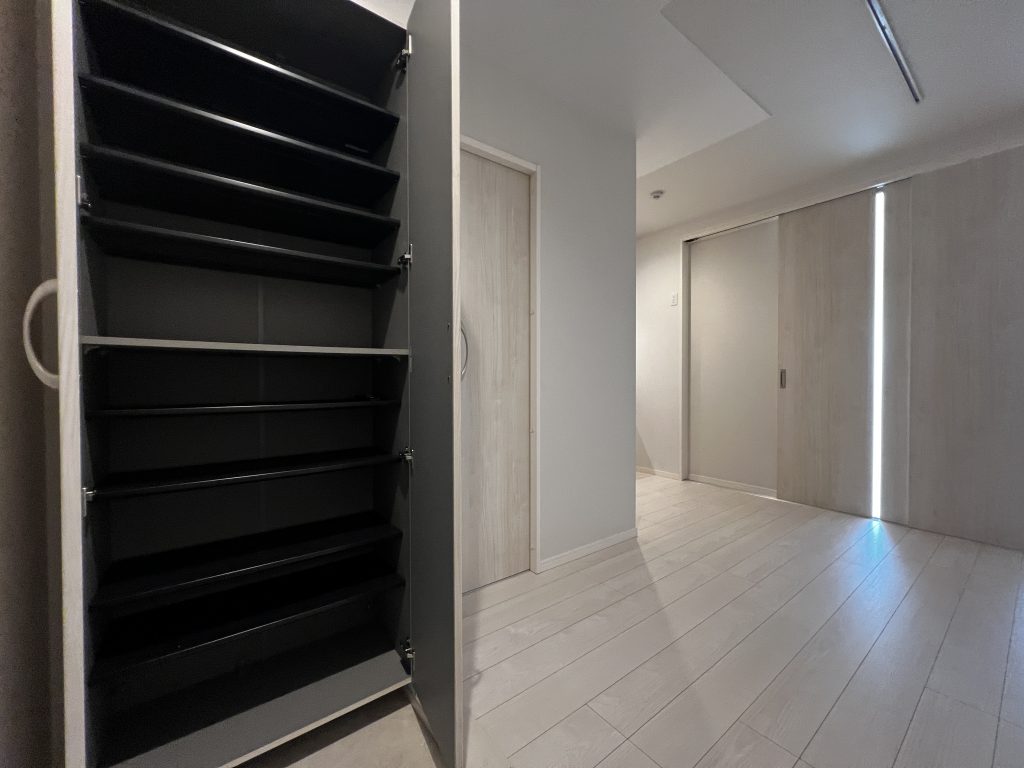 左手には、天井までの高さがある玄関収納(シューズボックス)が設置され、一般的なシューズボックスに比べて収納量が格段に豊富です。