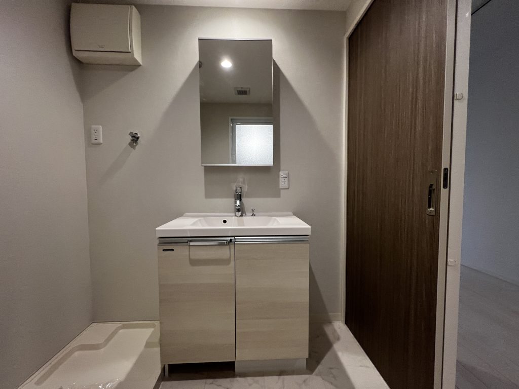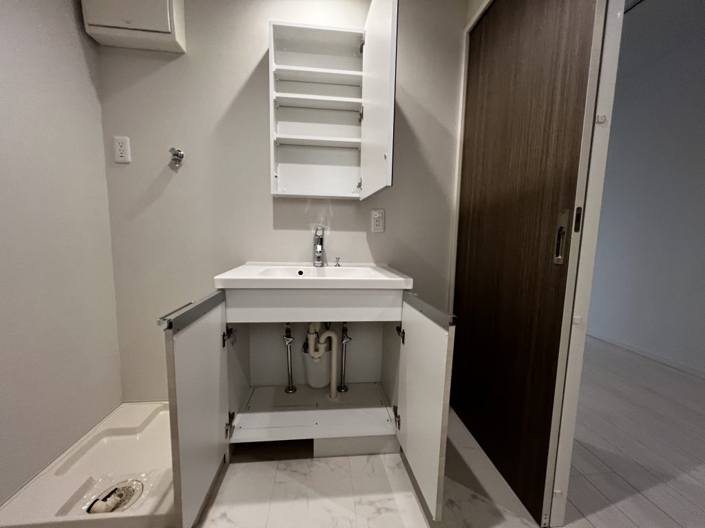 洗面台の横には便利なスペースがあり、ラックやキャビネットを設置することも可能です。