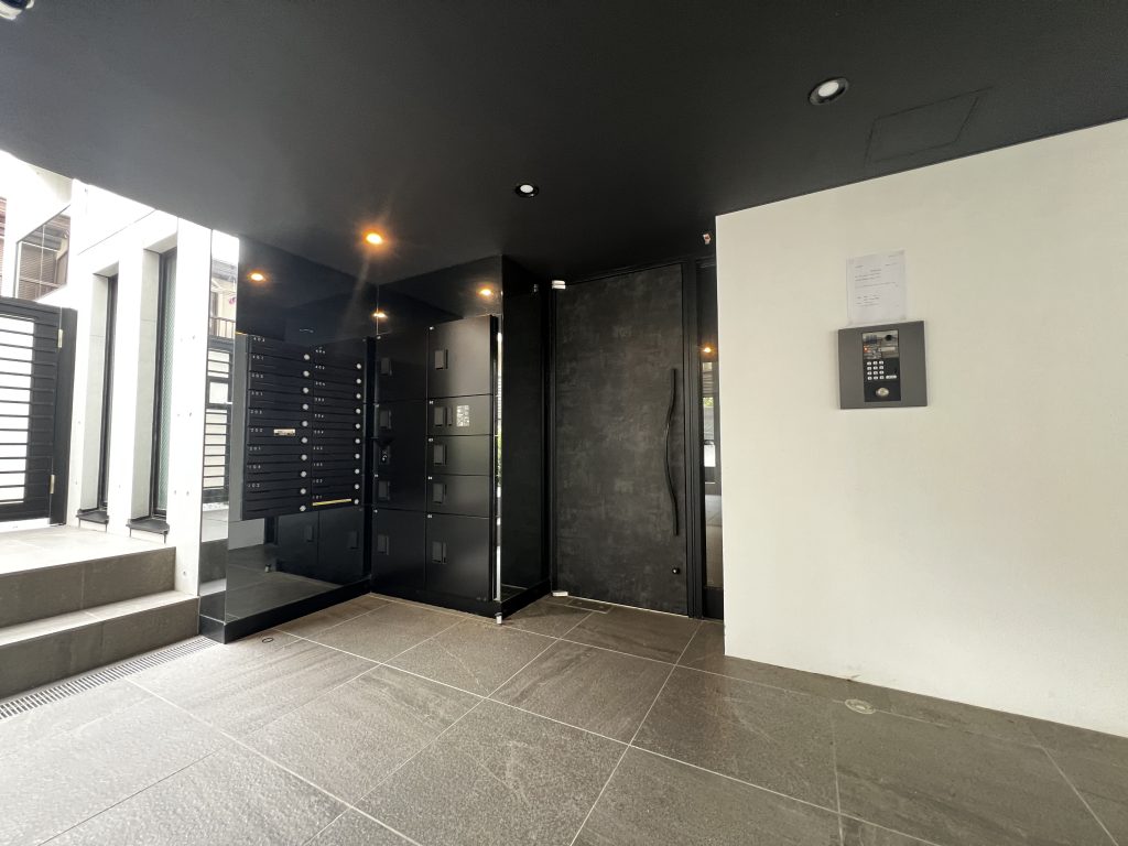 エントランス全体がブラックとホワイトで統一され、間接照明で照らされたお洒落エントランス空間。