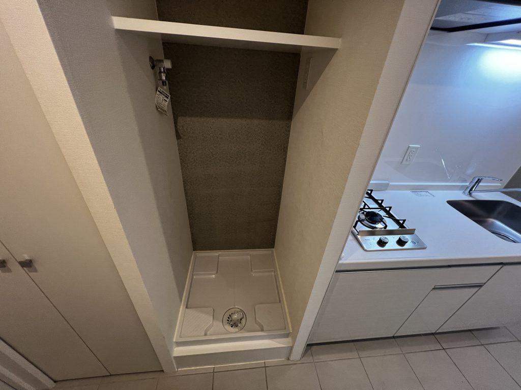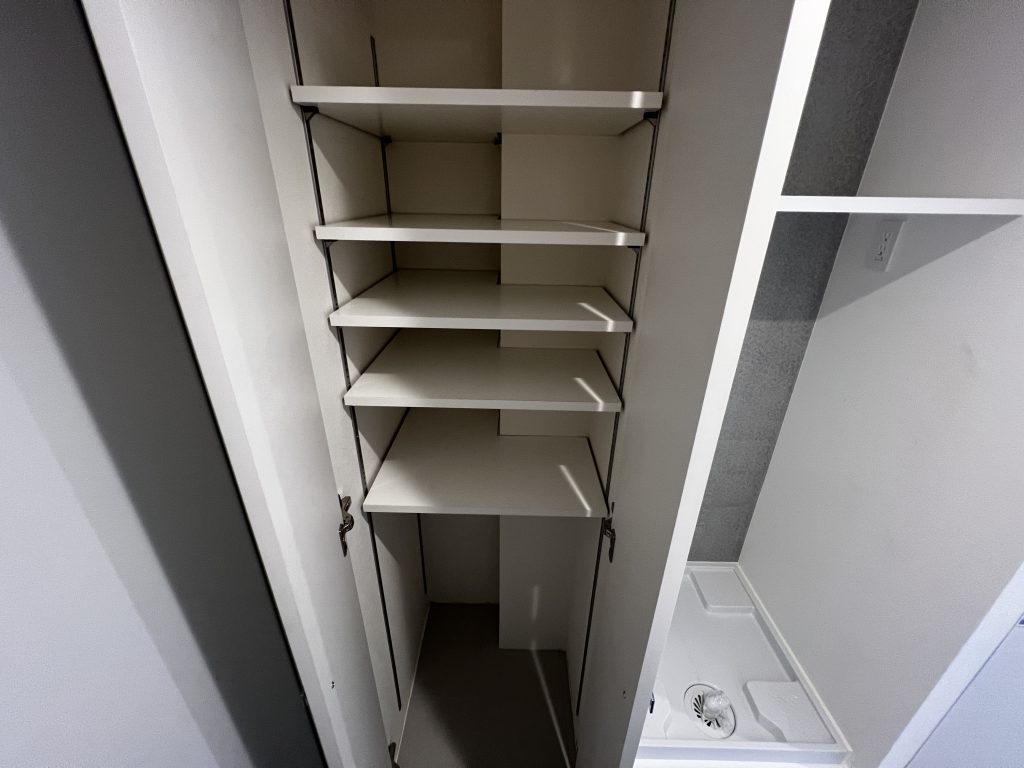 白基調の洗濯機置場は、収納棚も白で統一されており、洗濯機を置いても雑多な印象になりにくい点をアピールできます。