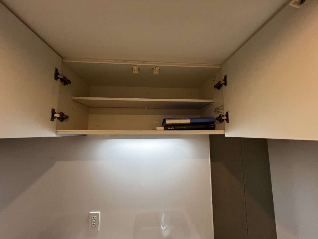 キャビネットや上部の吊戸棚があり、見た目以上に収納力が高くキッチン周りをいつもスッキリに片付けられます。