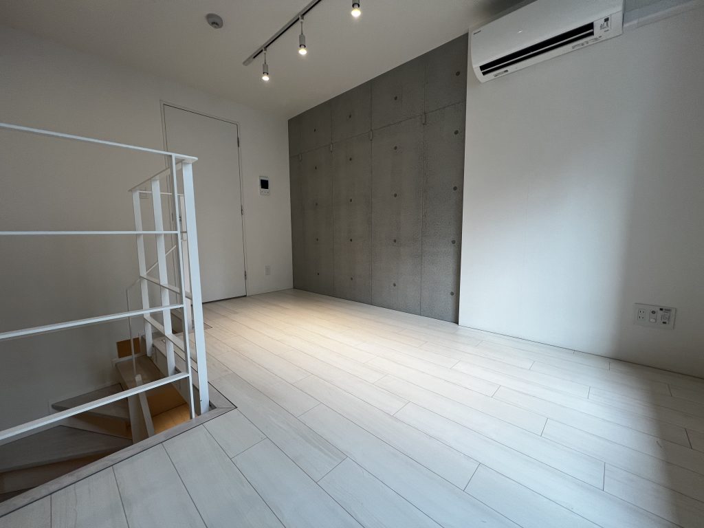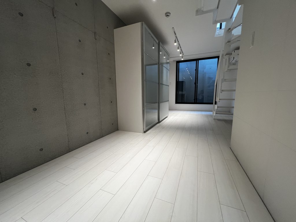 無機質なのに温かい!ホワイトフローリングとコンクリート壁のコントラストがおしゃれなデザイナーズ空間。