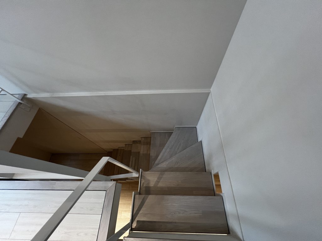 ダイニングと空間を繋ぐ、白いスケルトン階段が光と影を纏い、洗練された上質な雰囲気を醸し出します。