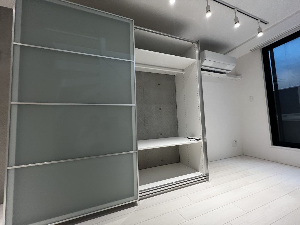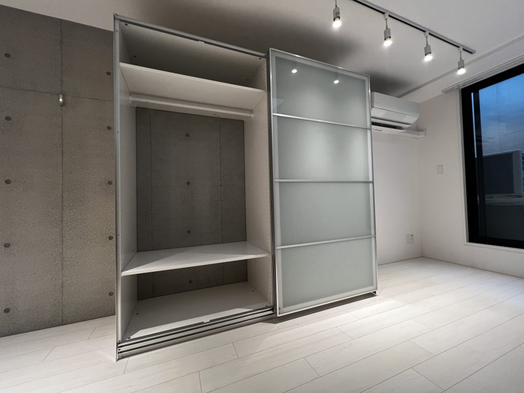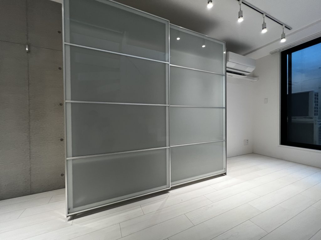 大きなクローゼットは半透明の扉で、高級ブティックのディスプレイのようなデザイン。
