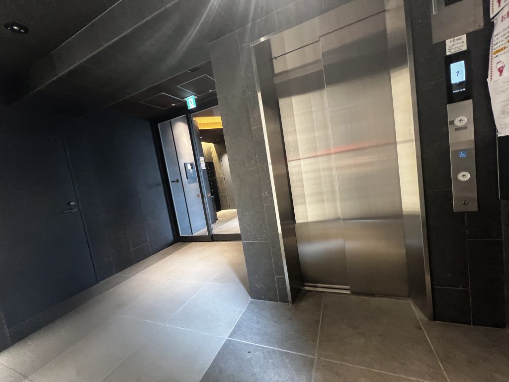 エレベーターの扉は鏡のような上質なステンレス素材。