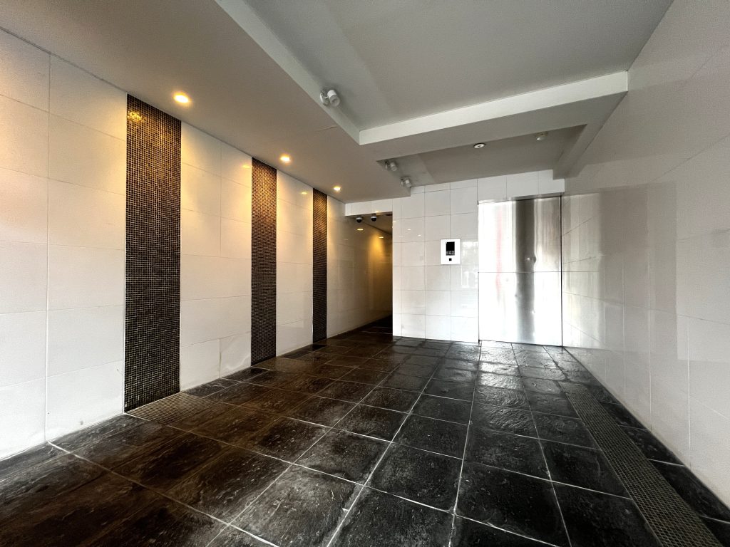 清潔感のある白のタイルと重厚な黒い床が、「カスタリア」らしい洗練された雰囲気を保ち、共用部のグレード感を高めています。