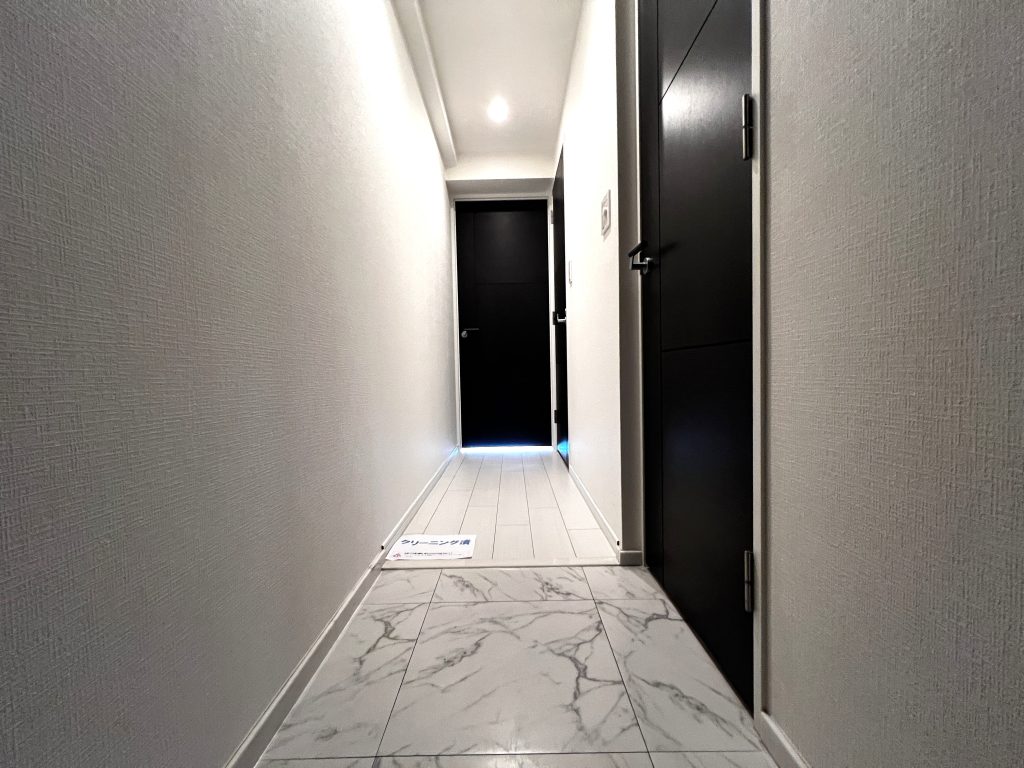 内廊下の落ち着いたトーンから一変し、清潔感と高級感を兼ね備えたモダンな空間がお出迎えします。