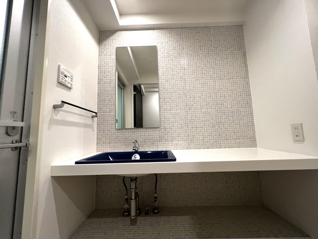 サニタリースペースの主役は、鮮やかなコバルトブルーのスクエア洗面ボウル。