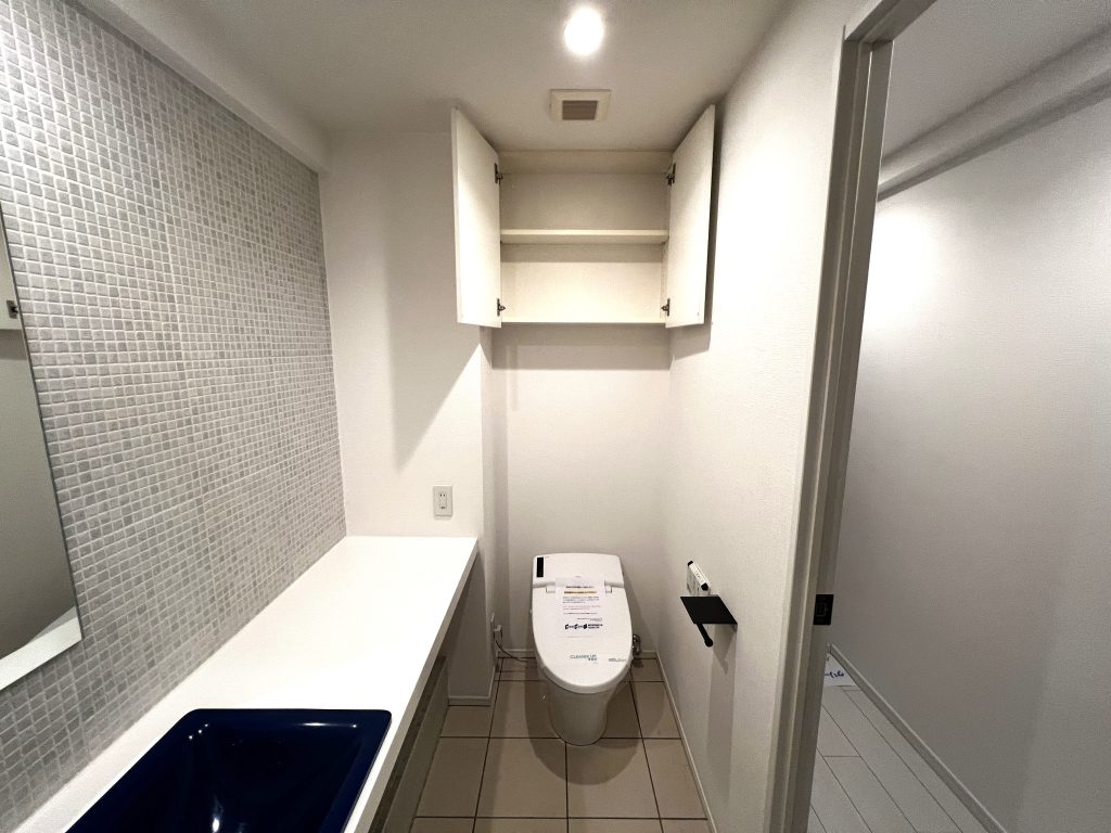 トイレ上部には、トイレットペーパーや掃除用品などをストックできる吊り戸棚が設置され、生活感を隠してすっきりと収納できます。