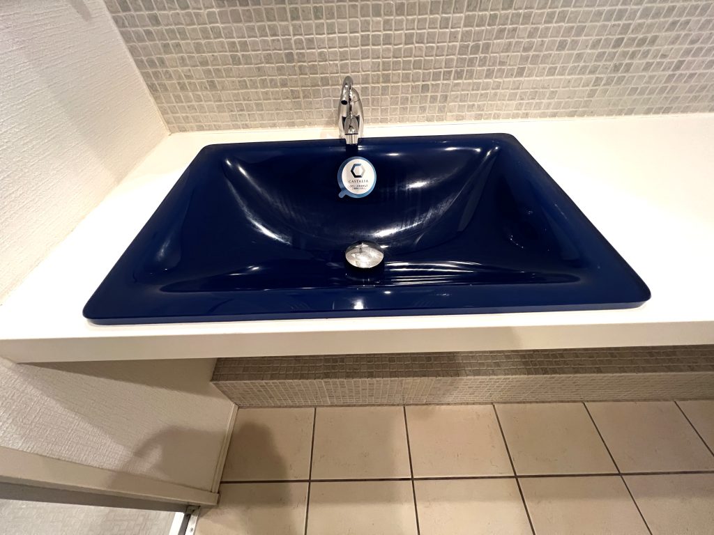 鮮やかなコバルトブルーのスクエア洗面ボウル。