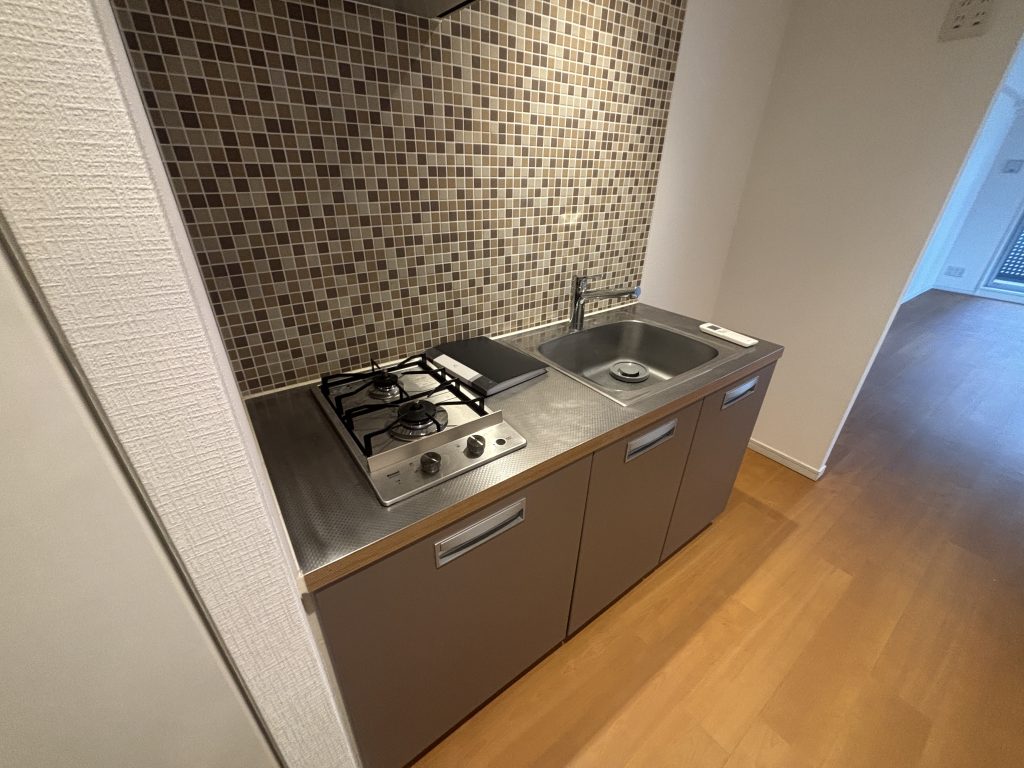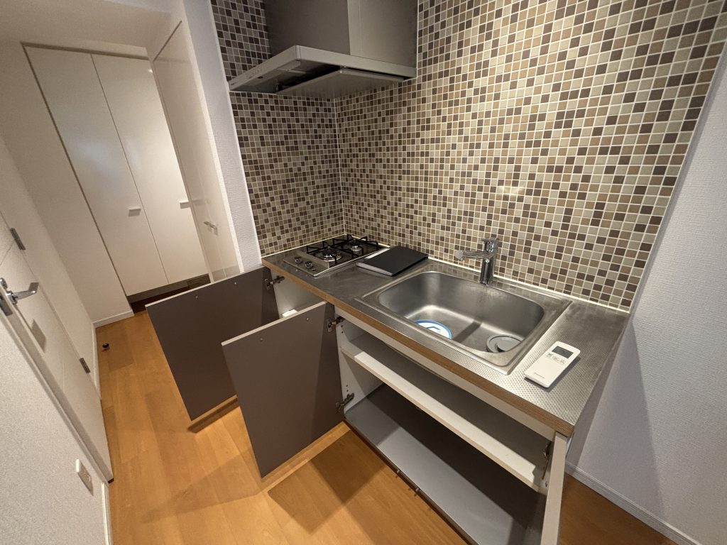 システムキッチンの下部には、扉付きの収納が確保されており、一人暮らしに必要な調理器具や食器は十分に収納できます。