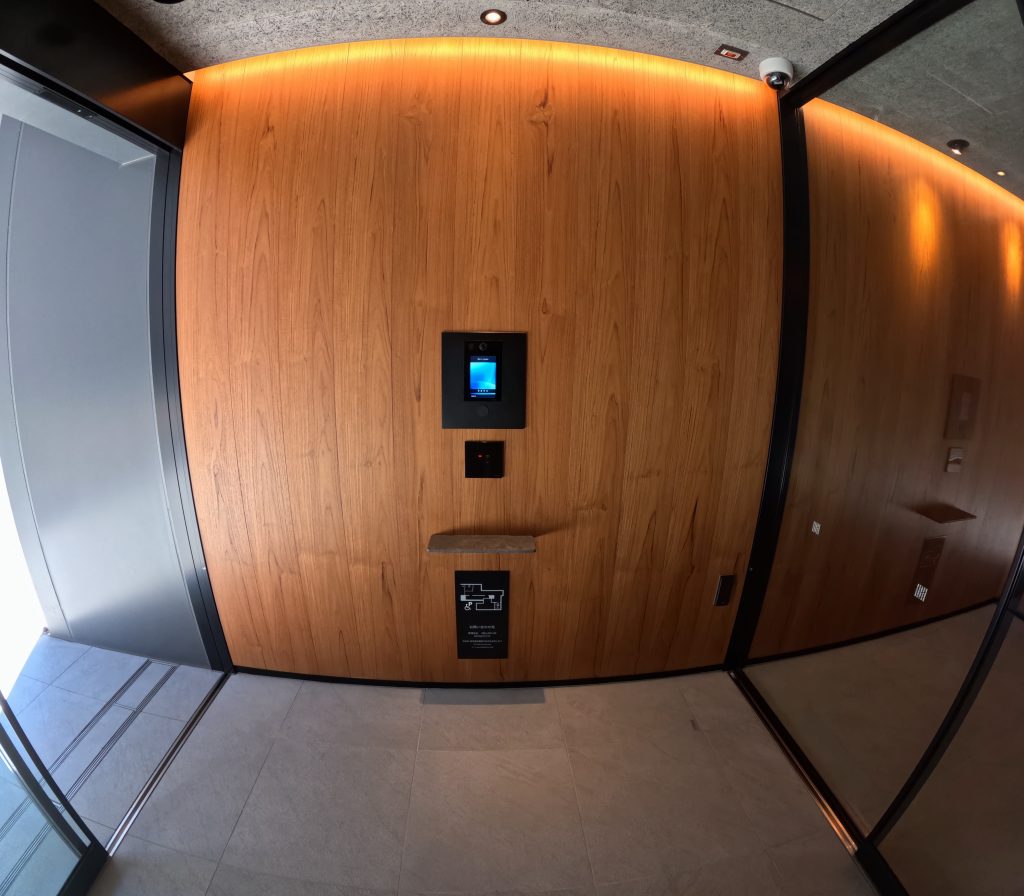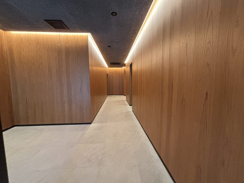外観のモダンさから一転、エントランスホールは温かみのある木目調と落ち着いた間接照明が特徴です。