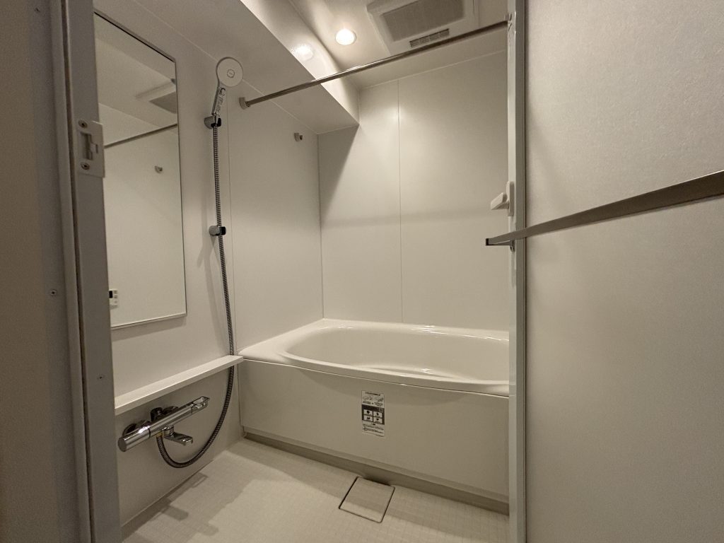 白い清潔感あふれる空間と、明るい照明が、リラックス効果を高めるバスルーム。