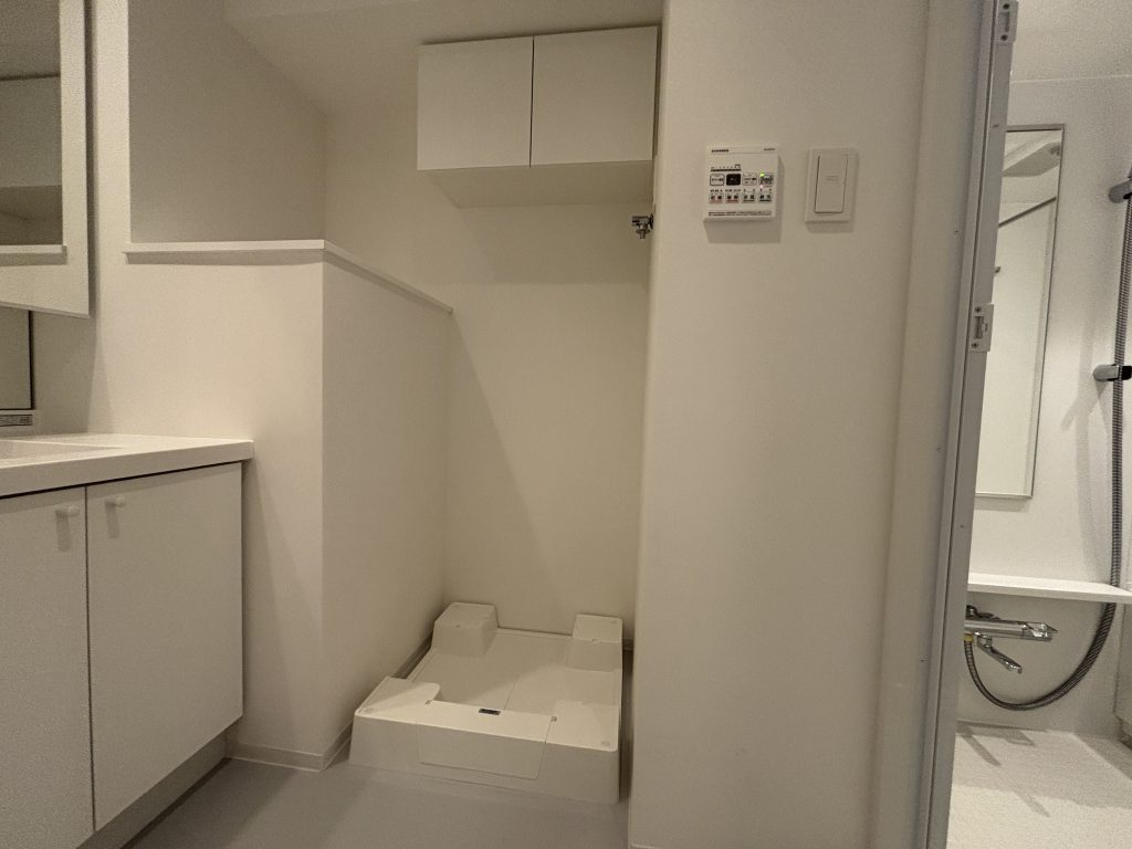 パウダールームには、洗濯機パンが設置されており、排水も安心。洗濯機を置いても、作業スペースとして十分な広さが確保されています。