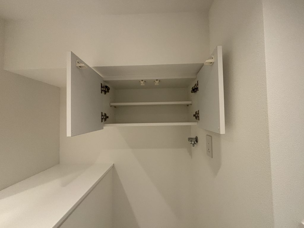ランドリースペース上部には、扉付きの吊り戸棚を完備。