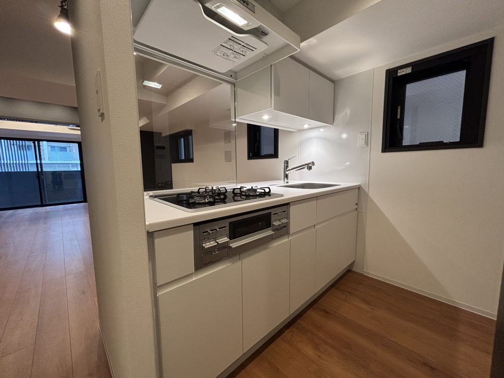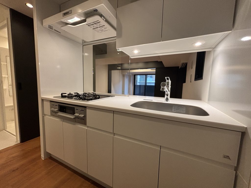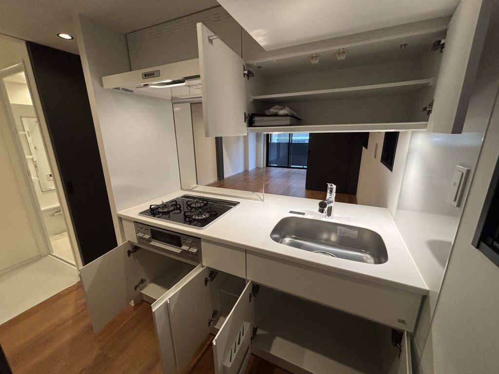 調理時の煙や匂いをしっかり吸い取るレンジフード付きで、お部屋に匂いが広がるのを防ぎます。