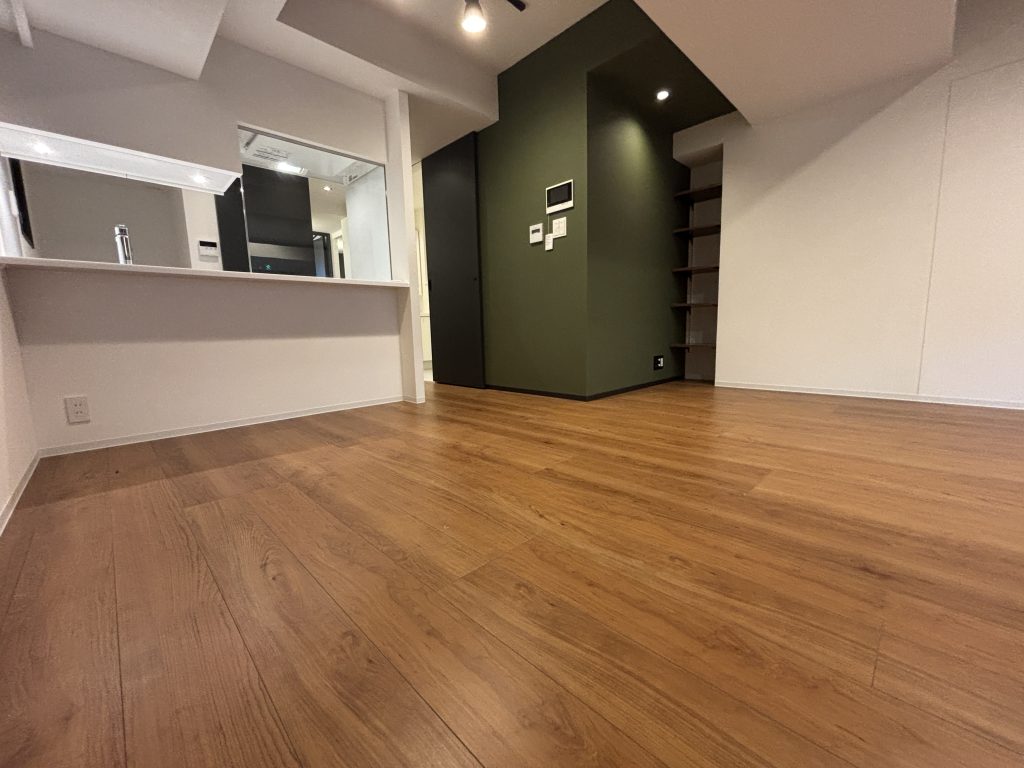 毎日を過ごすリビングダイニングには、深みのあるグリーンのアクセントクロスとダウンライトやスポットライトが、お部屋全体をスタイリッシュで落ち着いた雰囲気に演出しております。