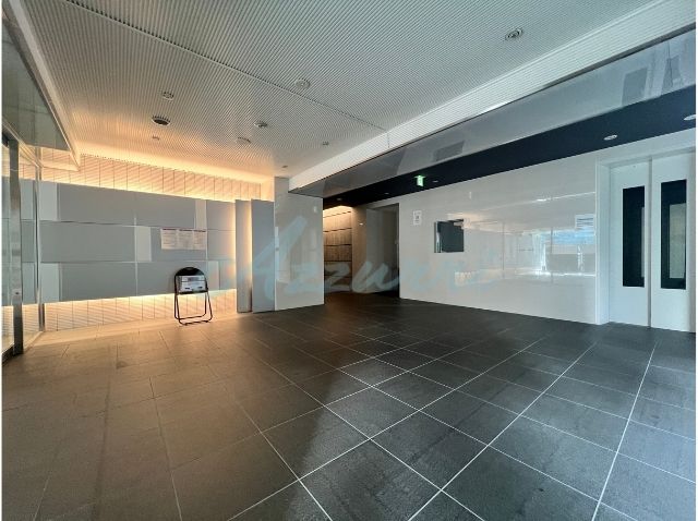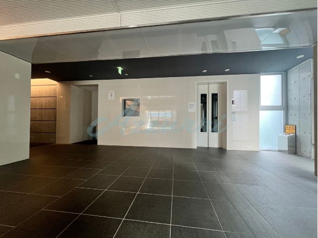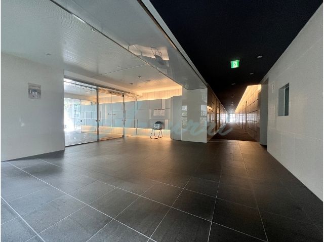 全面に敷き詰められたダークトーンの床タイルと、壁面の清潔感のあるホワイトパネルのコントラストがスタイリッシュで美しい、エントランスホールです。