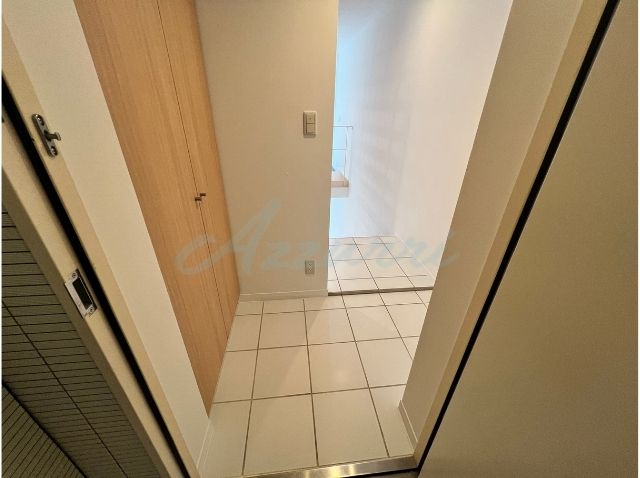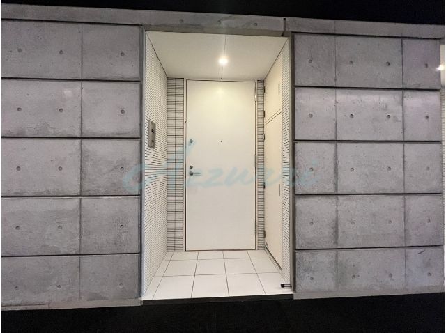 内廊下の重厚なコンクリート調の壁から、清潔感のあるホワイトタイル張りの空間へ切り替わり、私邸へと誘う独立性の高いアプローチを演出しています。