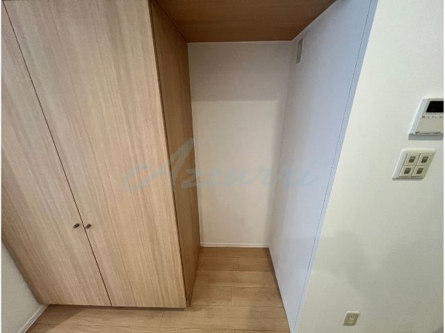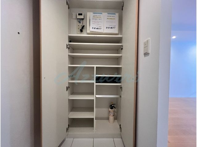 玄関横には、温かみのある木目調の扉で、お部屋のインテリアにも調和するシューズボックスが設置されています。