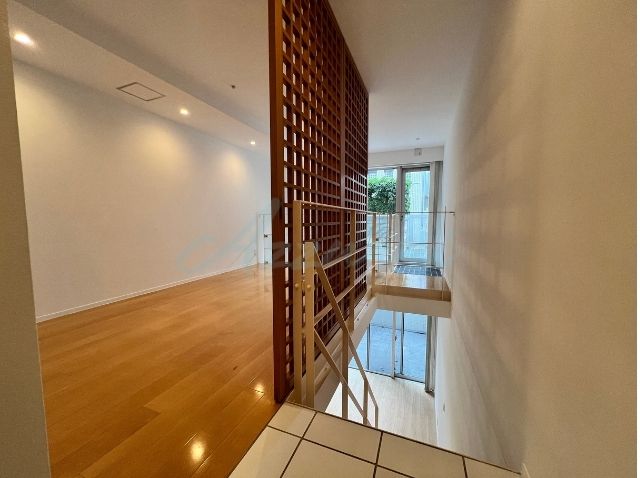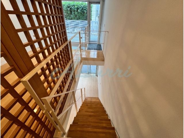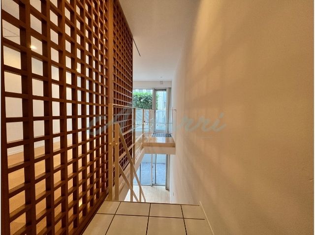 温かい木目調のステップと、空間のアクセントとなる木製ルーバーが組み合わさり、和モダンで洗練された雰囲気を演出しています。