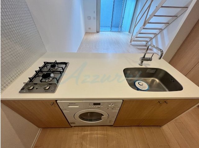 調理スペースを確保しながら、洗濯機能も備えるオールインワン設計。