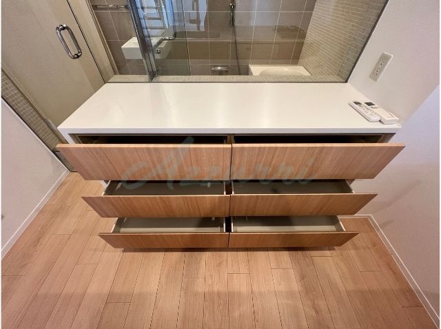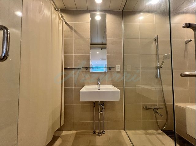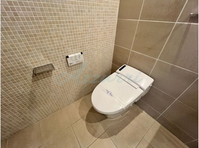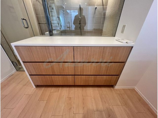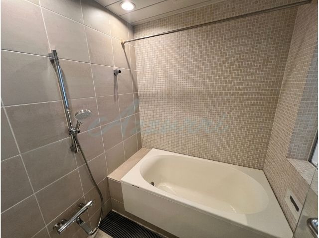 壁面には、バスルームと共通のベージュ系のタイルが使用されており、高級感と落ち着きのある空間を演出しています。