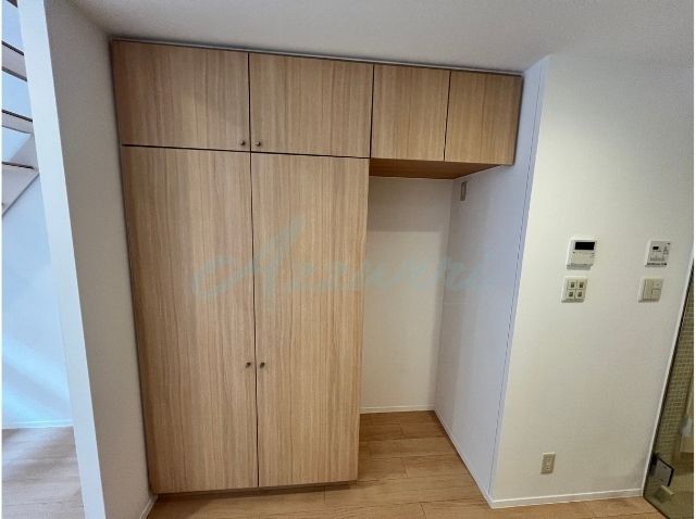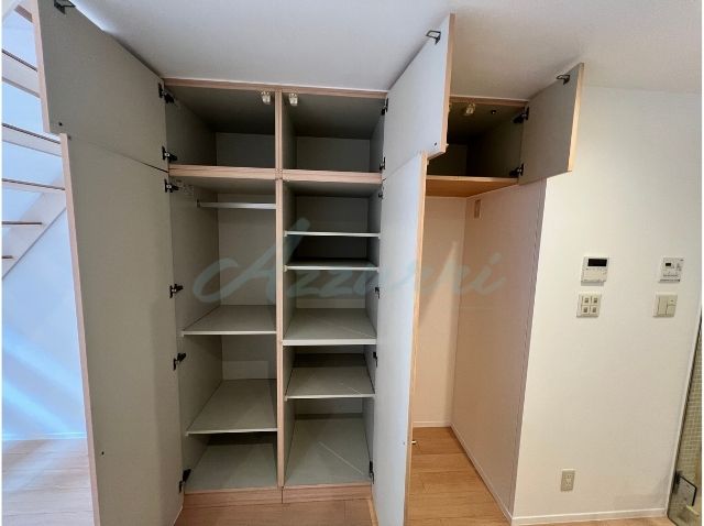 キッチンや水回りへの動線付近には、天井までの高さと奥行きを活かした大型の収納を設置。