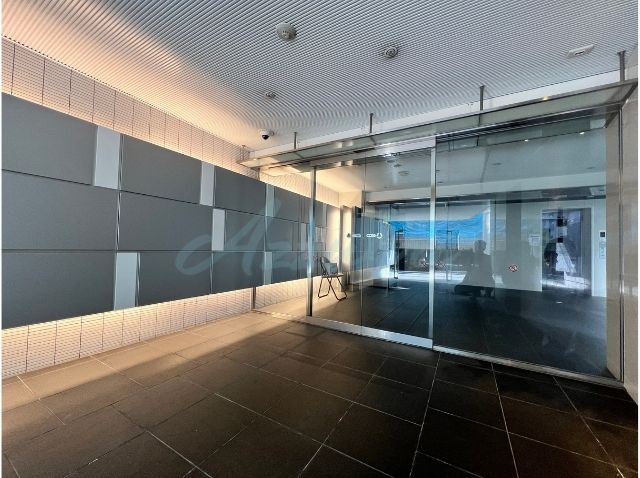 夜間も明るく安全で、ガラス張りのオートロックと、天井に取り付けられた防犯カメラが、高いセキュリティ性を視覚的に示唆 。