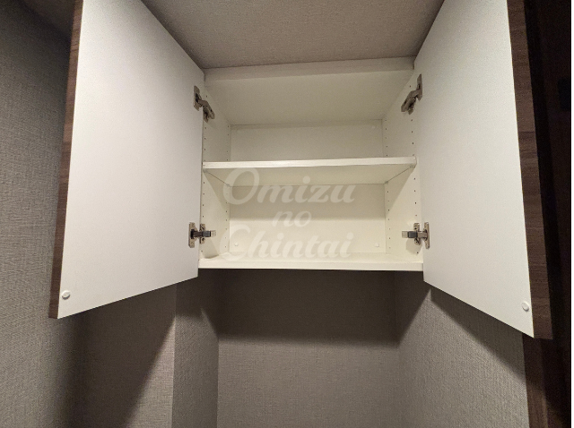 便器の上部には、扉付きの収納棚があり、消耗品や掃除用品など、雑多になりがちなものを隠して収納できるため、常に清潔感のある空間を維持できます。