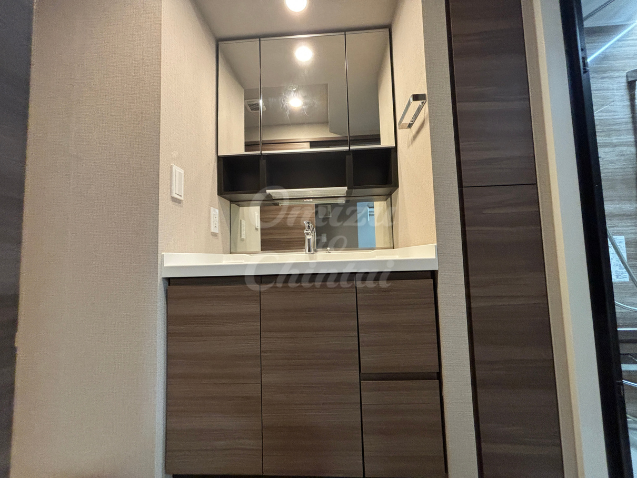 支度を快適に♪三面鏡と大容量収納のパウダールーム。