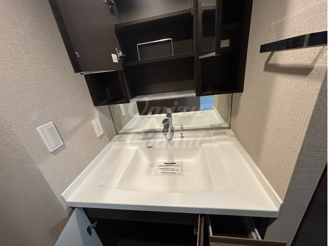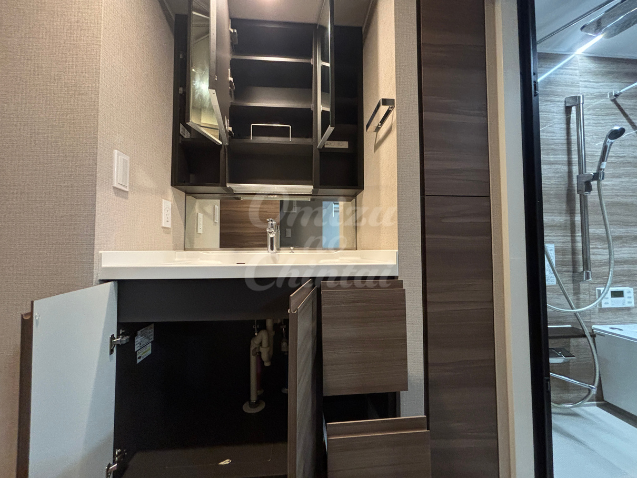 洗面ボウルの下は、深さのある引き出しと開き戸になっており、洗剤のストックやタオル、ドライヤーなどをすっきり収納できます。