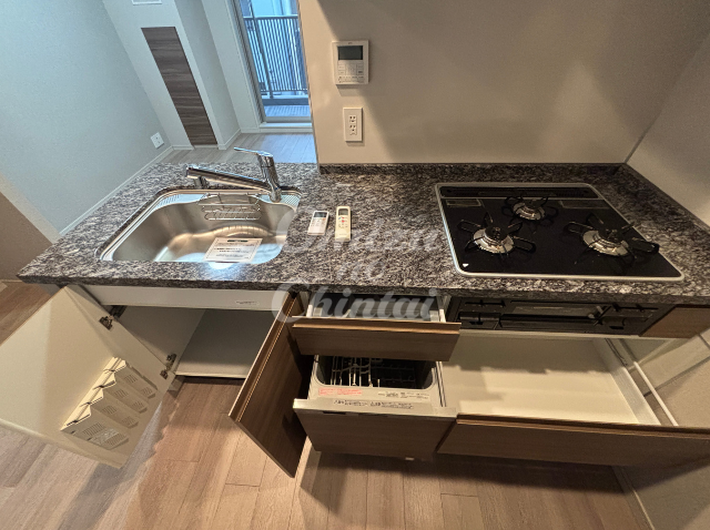 - 充実の設備で自炊をサポート、3口コンロと食洗機付きキッチン。