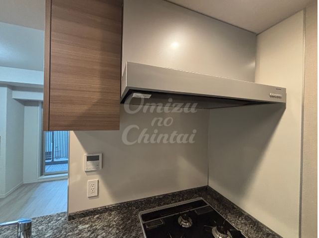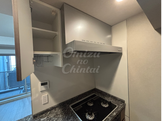 換気扇の横にある吊戸棚には、調理器具や調味料を効率よく収納できるフックや棚板が見られ、キッチン周りをいつも清潔に保てます。