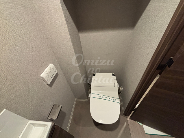清潔感のあるホワイトの便器と、壁のモダンなグレーのクロスが、落ち着いたプライベート空間。