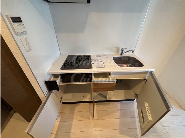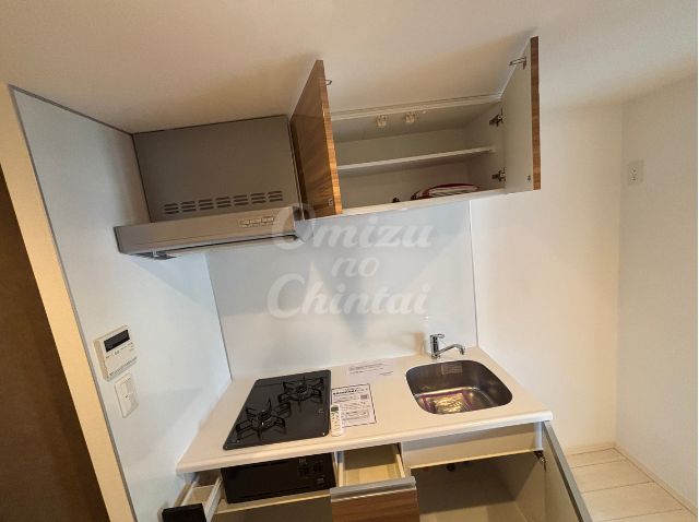 コンロは、2口ガスが設置され、限られたスペースながら、本格的な料理も楽しめます。